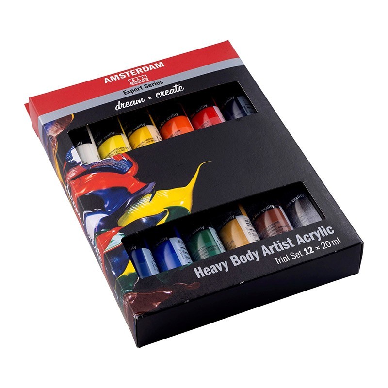 Komplet vsebuje 12 x 20ml osnovnih barv visokokakovostnih akrilov Amsterdam expert: