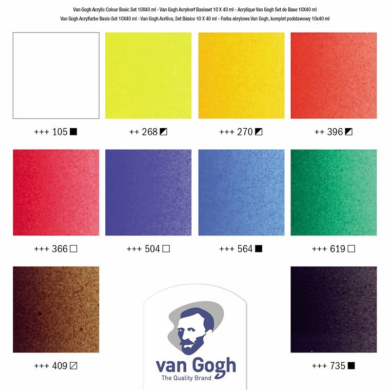Slikanje je užitek in z Van Gogh akrilnimi barvami lahko dosežete presenetljivo hitre rezultate. Van Gogh barve omogočajo enostavno uporabo, redčijo se z vodo in se hitro sušijo. Čopiče očistite z vodo. Z akrilnimi barvami Van Gogh lahko slikate na vse podlage od papirja, kartona in platen do mavca, itd… Komplet vsebuje tudi zloženko z navodili slikanja z akrilnimi barvami. Začnete lahko takoj!!!