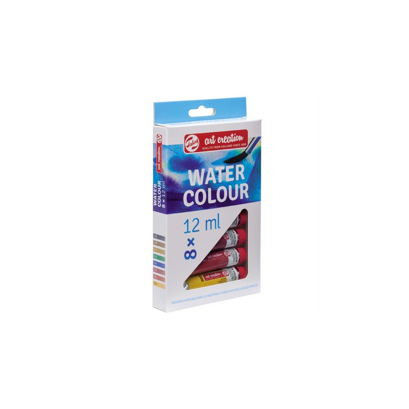 Talens Art Creation vam omogoča enostavno ujeti kreativne ideje. Akvarelne barve se redčijo z vodo in vam omogočajo slikanje s transparentnimi barvami. Več vode dodajate, svetlejše postanejo barve. Če slikate na mokro podlago se med seboj prelivajo, tako nastanejo presenetljivi barvni učinki, še posebej primerni za slikanje neba in vode. Komplet vsebuje 8 osnovnih barv primernih za začetnike.
