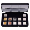 Komplet vsebuje: 12 akvarelnih barv v panjih (kocke), čopič št. 6 in priročno paleto. Komplet je primeren predvsem za delo na temen papir. Komplet ima veliko prostora za mešanje barv. Enostavno se čisti, kocke lahko vzamete ven, ter jih zamenjate z novimi. Barve: