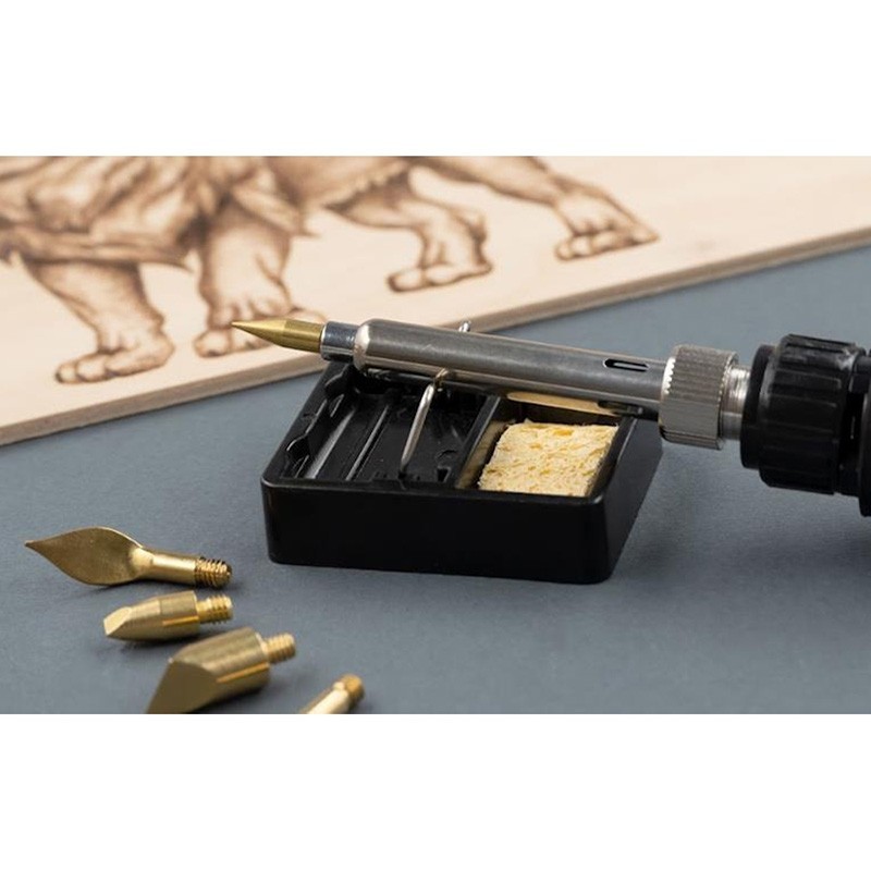 Komplet vključuje pet izmenljivih konic različnih oblik, ki se varno privijejo in omogočajo raznolike učinke – od finih linij do širokih potez. V kompletu sta tudi priročno kovinsko stojalo, gobica za čiščenje konic ter podrobna uporabniška navodila, ki pomagajo pri prvih korakih.