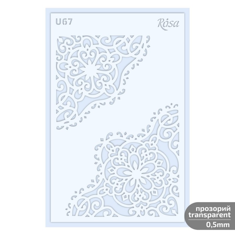 Šablona izdelana iz prozorne plastike debeline 0,5 mm je idealna za delo s pastami, geli in gosto akrilno barvo, saj omogoča ustvarjanje jasnega tridimenzionalnega reliefa. Ena glavnih razlik med večkratno uporabno šablono in samolepilno je odsotnost lepilne plasti, kar omogoča uporabo večkratne šablone na občutljivih ali že predhodno okrašenih površinah, pri čemer se dekorativni sloji ohranijo v visoki kakovosti.